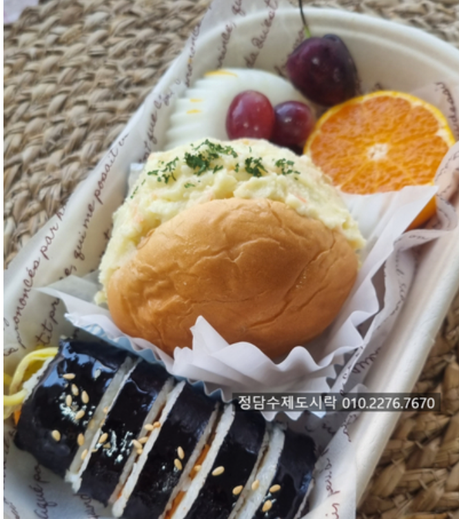 김밥반쪽과 모닝빵샌드위치와 과일구성이 어떠실지 추천드리고